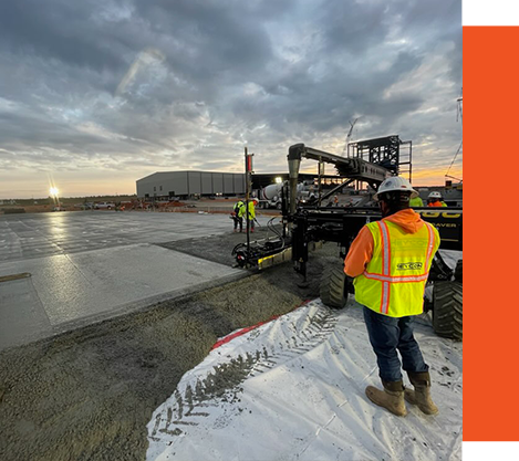 Laser screed slab-on-grade is a method used to achieve precise, level concrete surfaces for floors, utilizing a laser-guided machine to ensure accurate leveling and smoothness. Our process involves placing and finishing the concrete slab by first pouring the mix, followed by leveling, smoothing, and troweling to create a durable, high-quality surface suitable for various industrial, commercial, or residential applications. This technique ensures efficiency, precision, and a consistent finish for large-scale slab projects. We can meet and exceed tight FF/FL specifications for our customers.