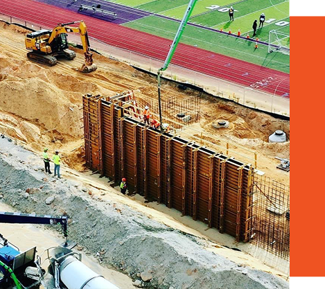 Our experience in vertical concrete walls and structures allows our clients to provide durable long-term solutions for their facilities. Our engineering team provides forming and shoring plans to execute a safe, long-lasting structure. We have decades of experience from our office to field teams with all facets of vertical concrete construction utilizing multiple forming systems.